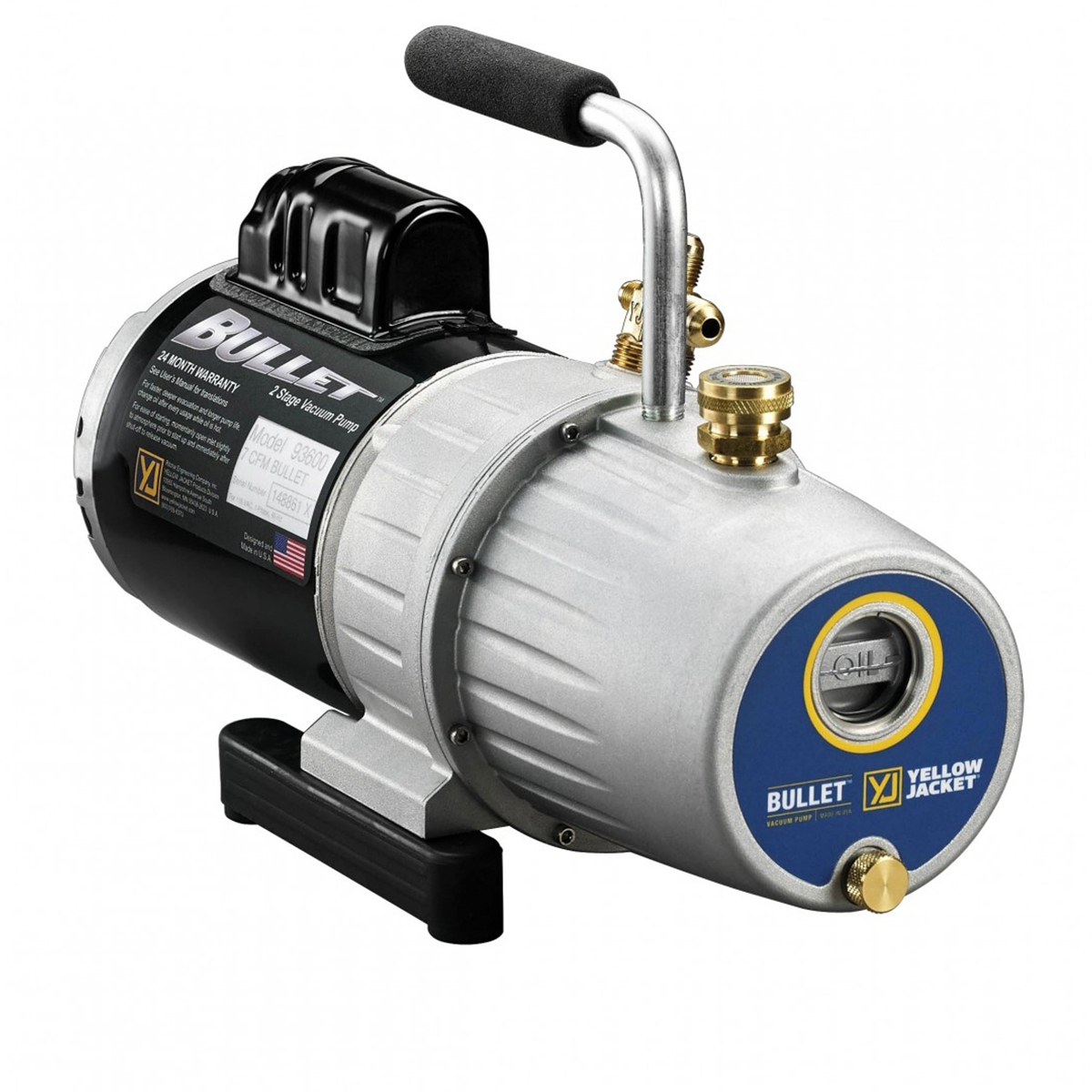 Wide mouth oil reservoir port for easier, cleaner filling. The YELLOW JACKET® BULLET™ vacuum pump is a two-stage rotary vane oil-sealed 3, 5 & 7 CFM pump that pulls down to 25 microns or better.