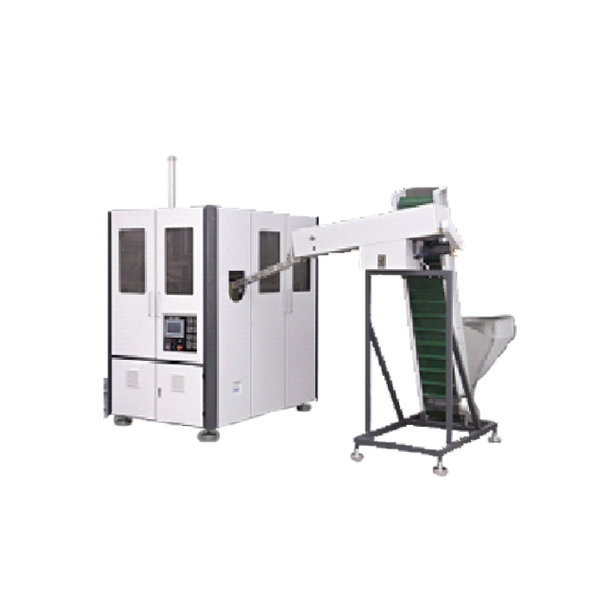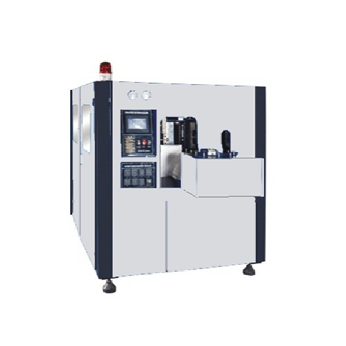 The automatic bottle blowing machine adopts novel and innovative modular design structure and linear full-automatic down-rotating up-bottle blank structure, with fast up-bottle blank speed and infrared lamp heating elements.